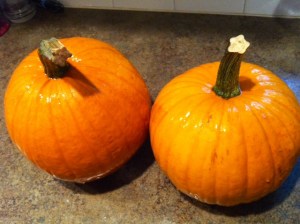 1-2 sugar pie (or baking) pumpkins – your local farmer or grocer will be able to point you in the right direction. They are generally small, round, pretty smooth pumpkins with little speckles on them.