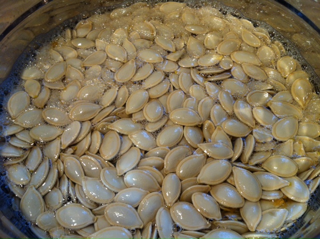 Remove the “guts” as my boys would call it. Be sure to scrap the inside well with a spoon to remove any of the stringy pulp. Separate the seeds into a bowl and rinse. If you fill the bowl with water, the seeds will float and the pulp will generally sink to the bottom. Lay on a paper towel to dry. We will be roasting them later this week 🙂