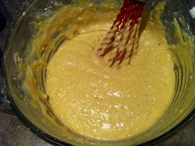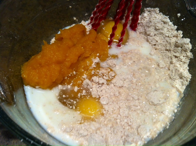 - Add eggs, milk, pumpkin and vanilla, reserving some of the milk (or water) until the end so you can get the consistency you desire.