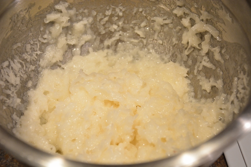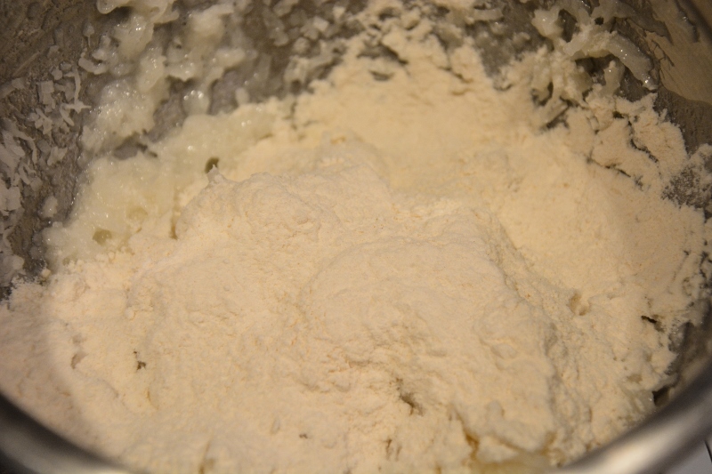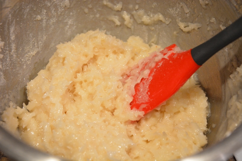 Cook over simmering water, stirring constantly until it is thoroughly heated and sugar is dissolved. Remove from heat. Stir in almond extract. Add coconut and flour. Stir until incorporated. Cover and refrigerate for 1 hour (or if you are like me and can not stop shoving the dough in your mouth and are afraid it won’t last an hour, just stick it in the freezer until it is cool (15-20 minutes), stirring occasionally.