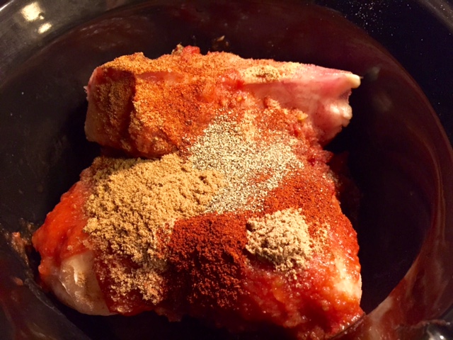 Place the frozen (or defrosted) chicken in the crock pot. I did not trim any of the fat because most of it will melt away anyways, then I find it much easier to pull off the larger chunks while I am shredding it.