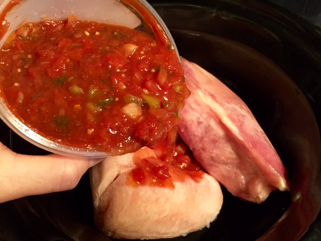 Now dump a container of your favorite fresh salsa over the top of the chicken.