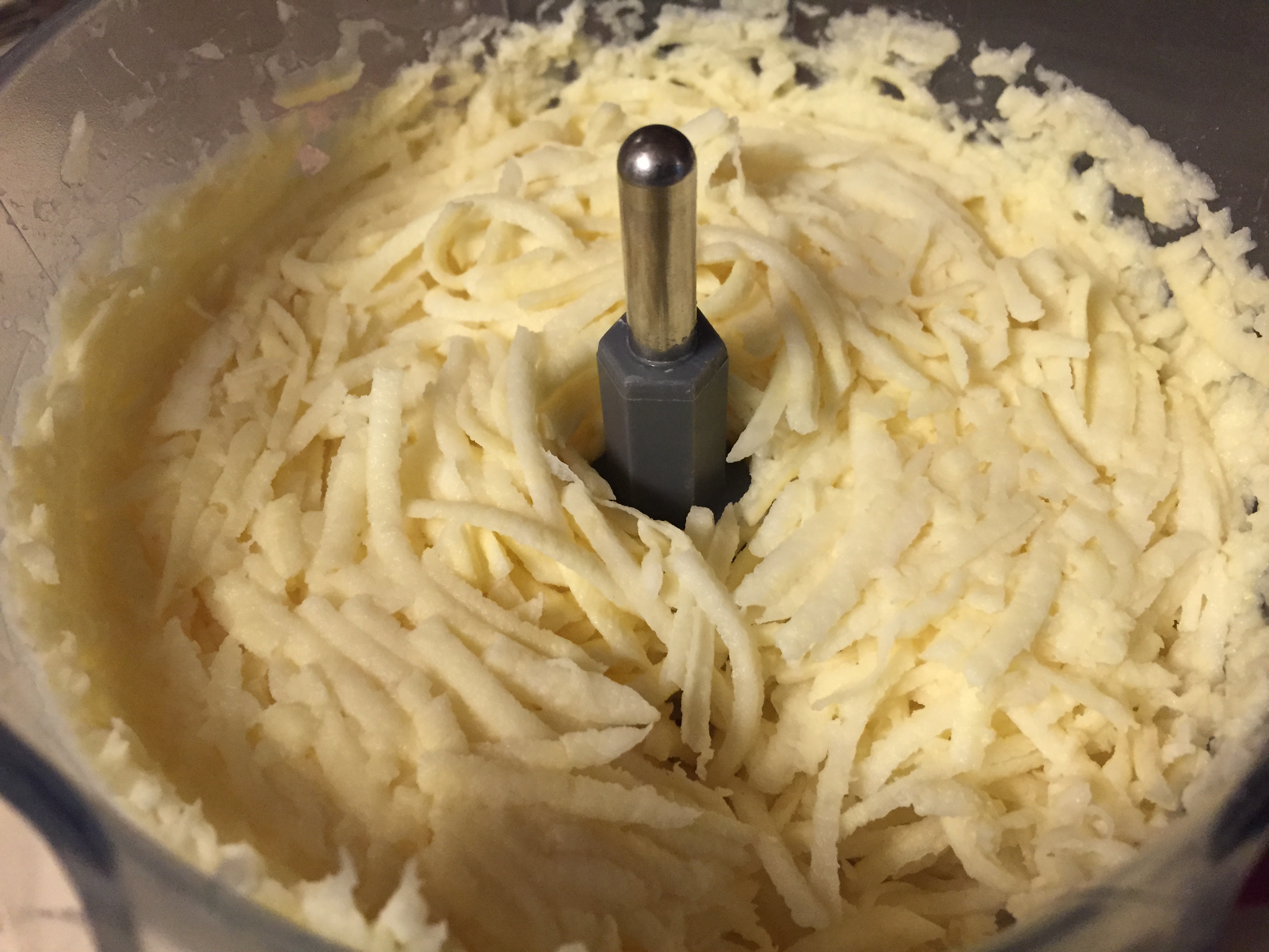 - Preheat oven to 350F. Peel sweet potatoes. Using a food processor, shred potatoes. If you don’t have a food processor, chop the potatoes into small pieces. Heat 2 tbsp. your favorite cooking oil (I LOVE avocado oil) in a large heavy-bottomed pan on Medium-high heat.