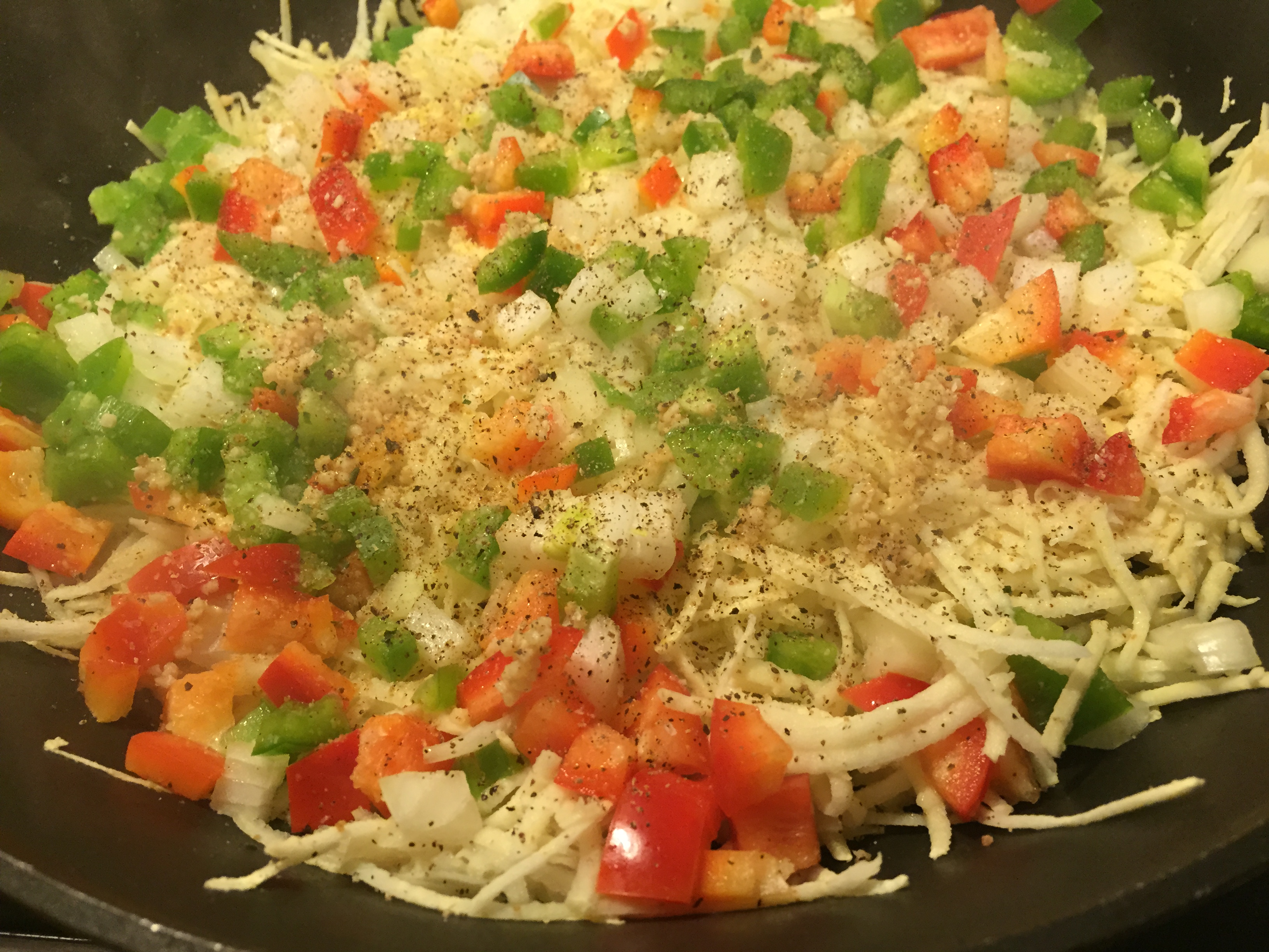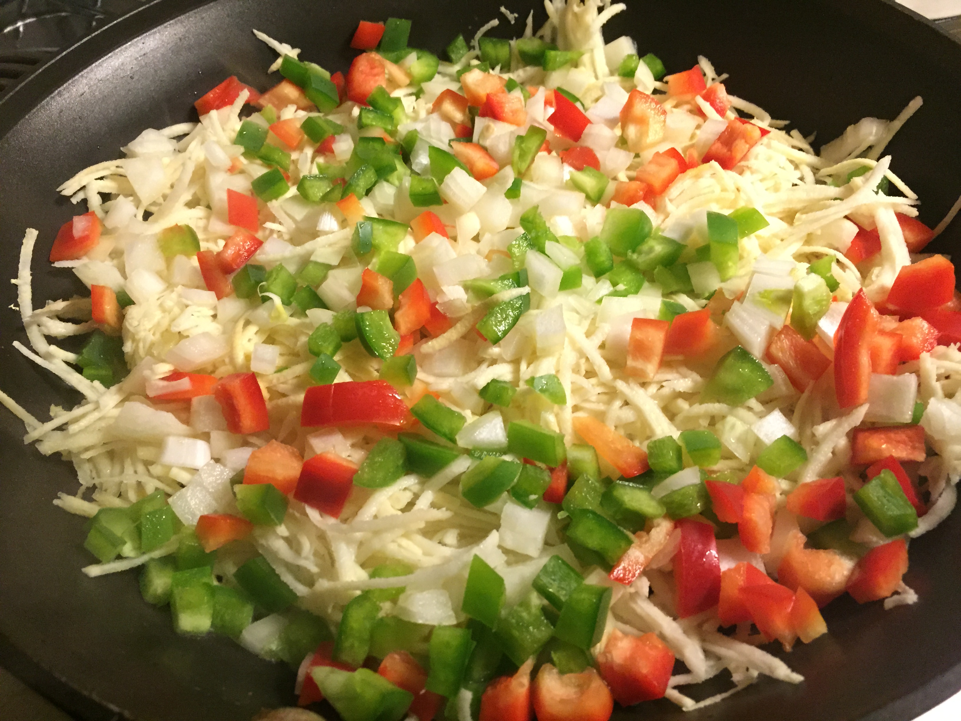 Do a sizzle test to make sure that the oil is hot enough. Add potatoes, peppers, garlic onions and seasonings. Wait for several minutes before checking the bottom of the potatoes to see if they are golden brown. Once they are crisp and brown, go ahead and turn them. The potatoes will not take too long to cook thoroughly. You don’t want them to get mushy. Be sure to taste them at this point. Season them until you feel like they would taste great alone. Continue to stir the potatoes every few minutes until they have a good brown color mixed throughout.