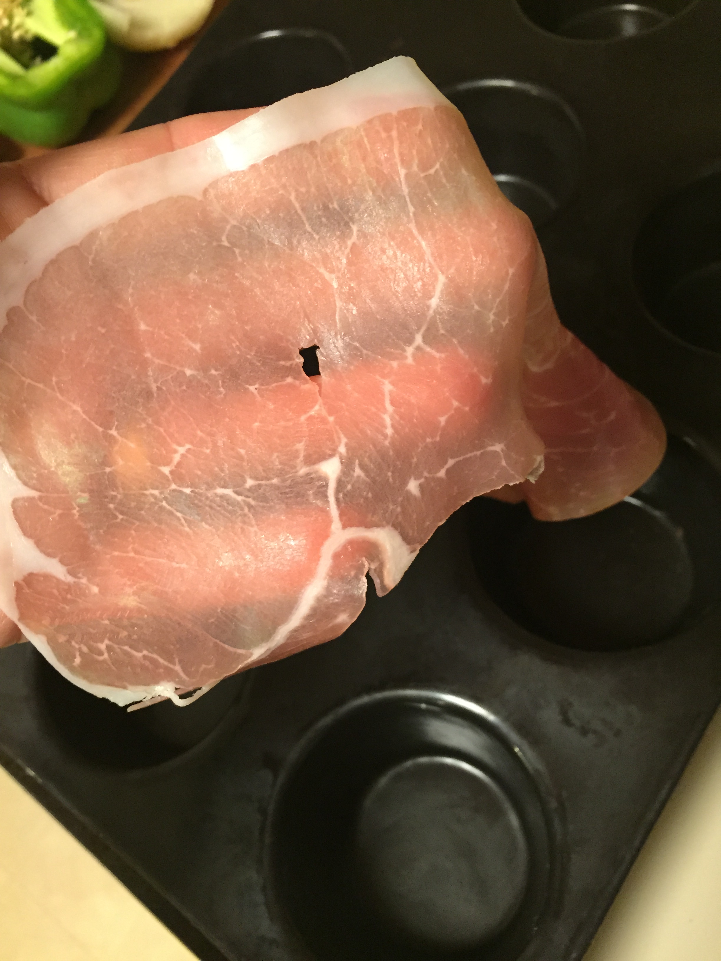 - Next, you will want to pull the prosciutto apart. It is pretty hard to separate without tearing, but if it does tear, no worries. Lay one piece of prosciutto in each cup of your cupcake pan (I could not live without my Demarle silicone cupcake pan. NOTHING will stick to it. If you are using a regular metal pan, be sure to use a good amount of non-stick cooking spray or cupcake liners or those babies will never come out.)