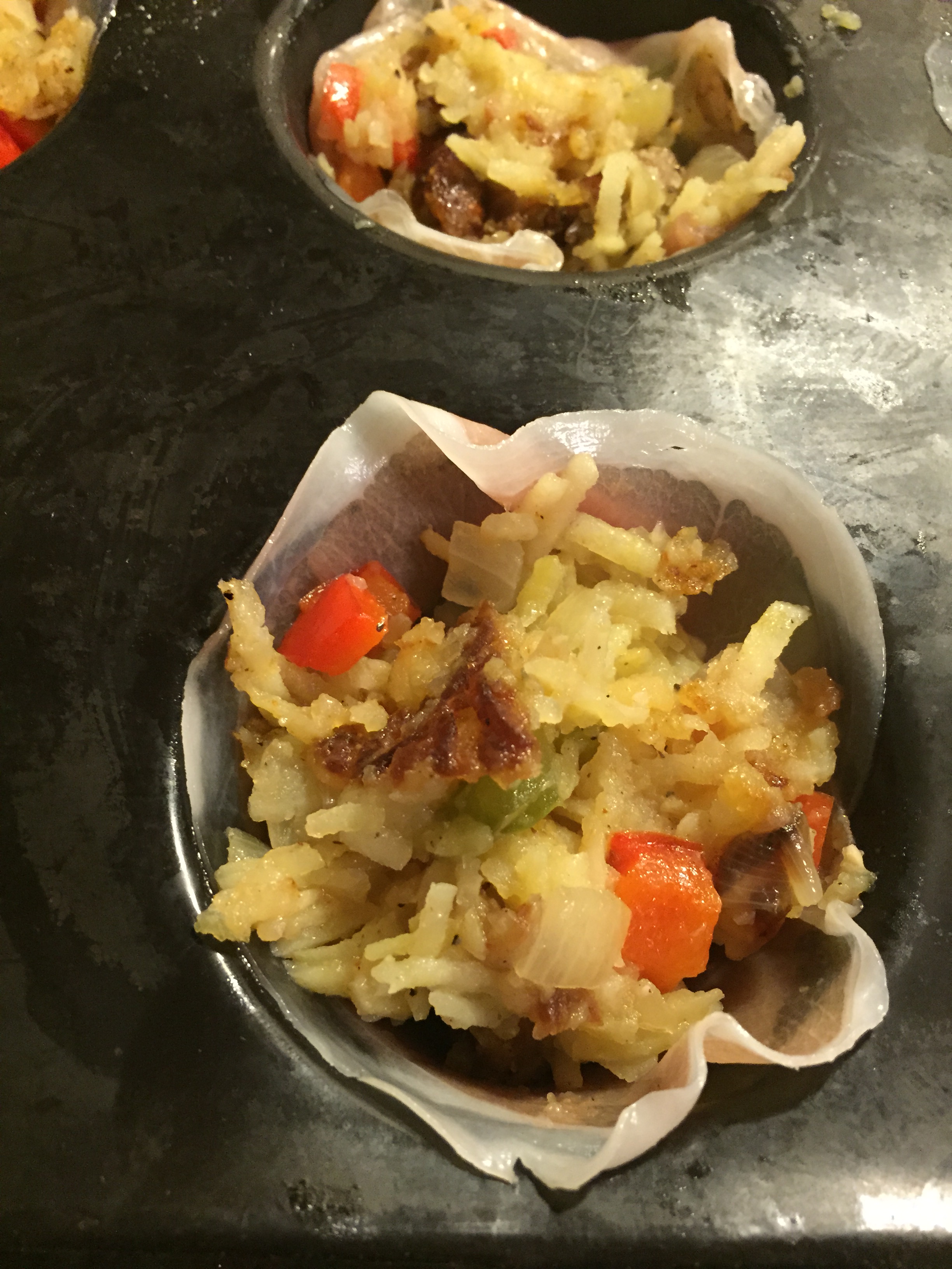 - Place your cooked hashbrowns inside the cups on top of the prosciutto. Fill the cup, but don’t pack it down.
