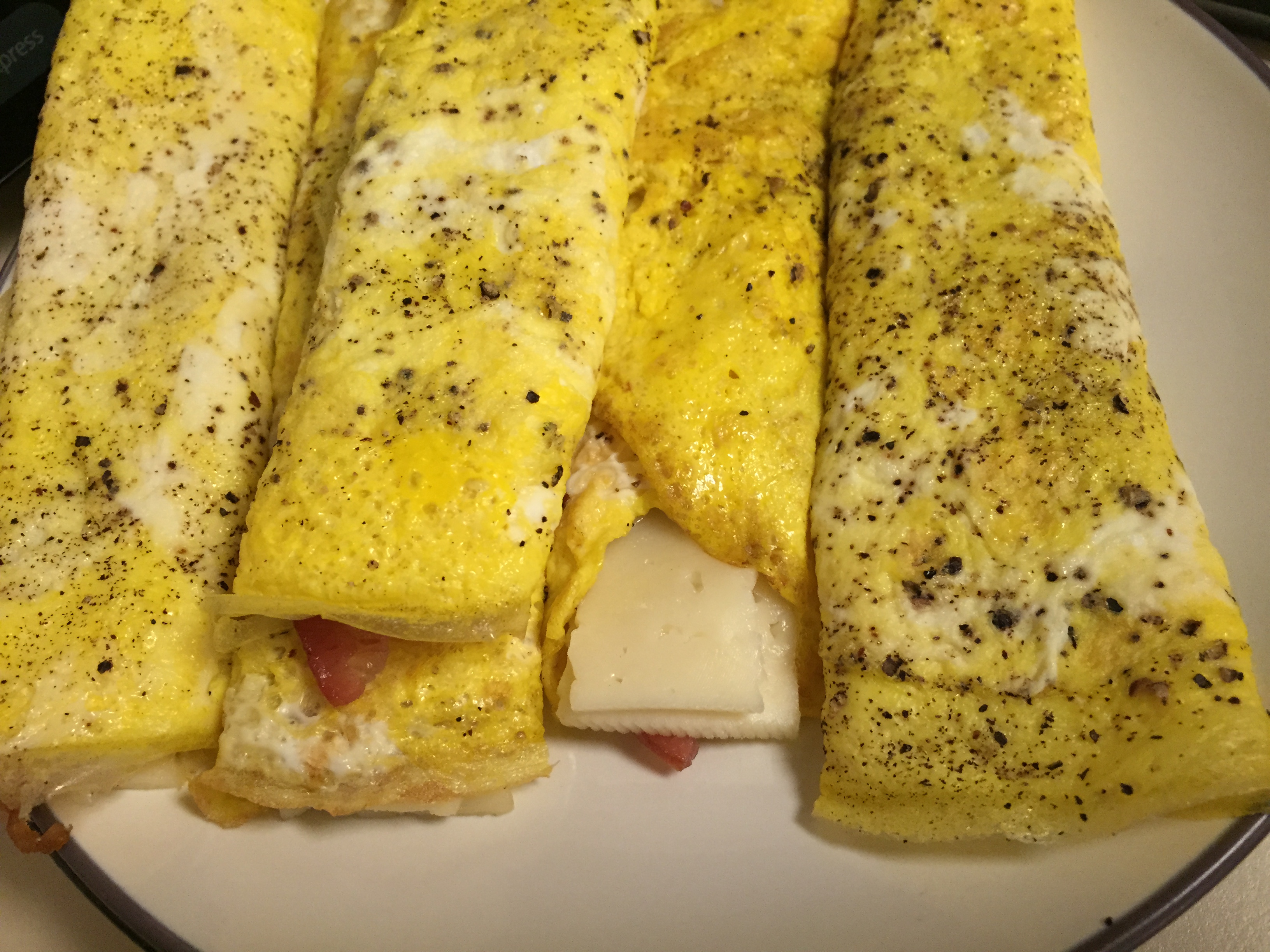 Remove from heat and place one slice of bacon (or you can use any meat of your choice here, sausage, ham, prosciutto, or make it vegetarian and do spinach, mushrooms, whatever your heart desires). Top with your favorite cheese, ours is Havarti (super buttery and creamy). You can even add a little bit of your favorite hotsauce (Tapatio, Cholula, etc.) then roll everything up inside the egg.