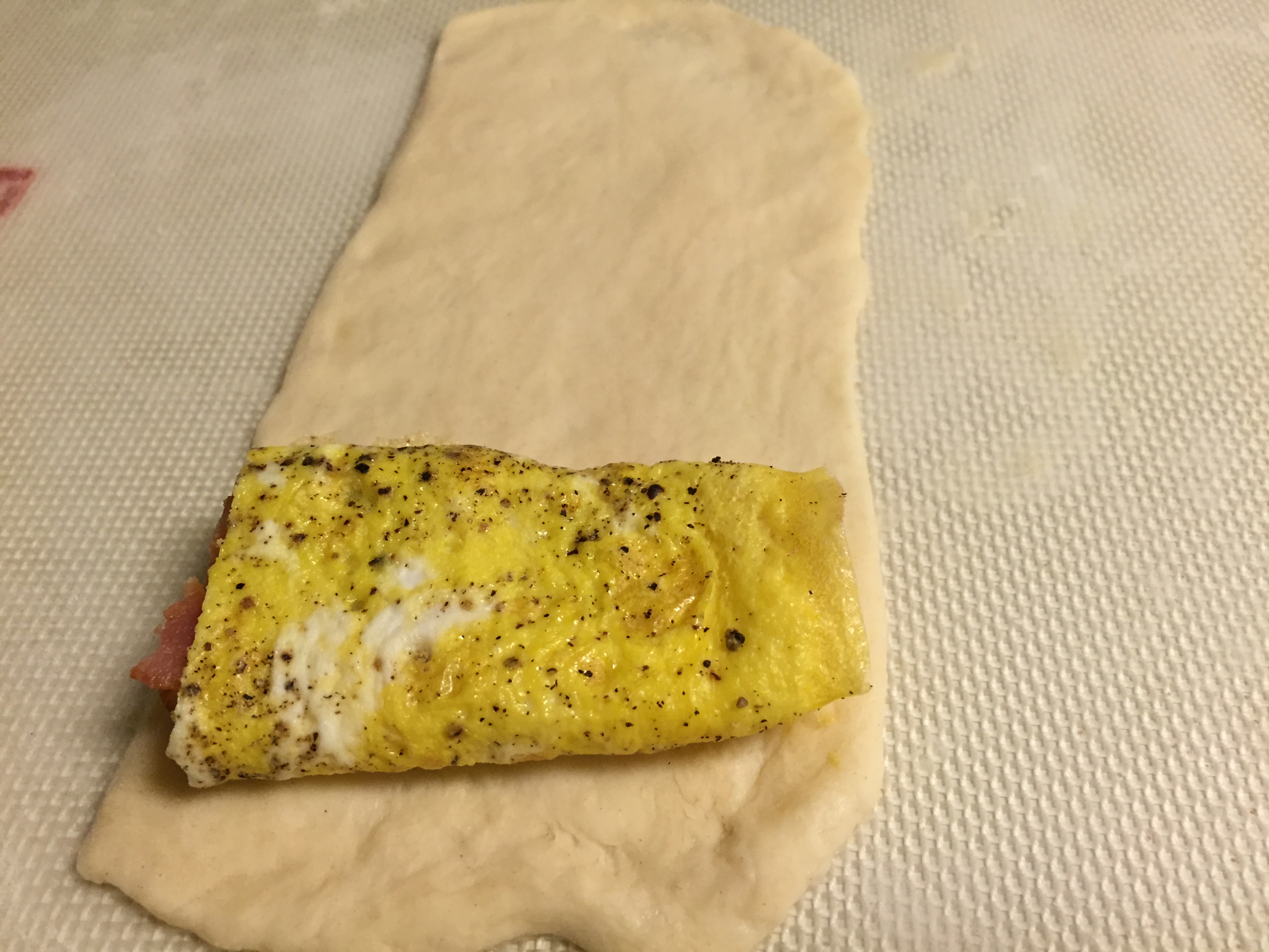 - Remove from heat and place one slice of bacon (or you can use any meat of your choice here, sausage, ham, prosciutto, or make it vegetarian and do spinach, mushrooms, whatever your heart desires). Top with your favorite cheese, ours is Havarti (super buttery and creamy). You can even add a little bit of your favorite hotsauce (Tapatio, Cholula, etc.) then roll everything up inside the egg. Each one of these little rolls will be cut in half. So make one for every 2 croissants. I did 10 breakfast croissants and 10 chocolate stuffed croissants (which I will be blogging next)
