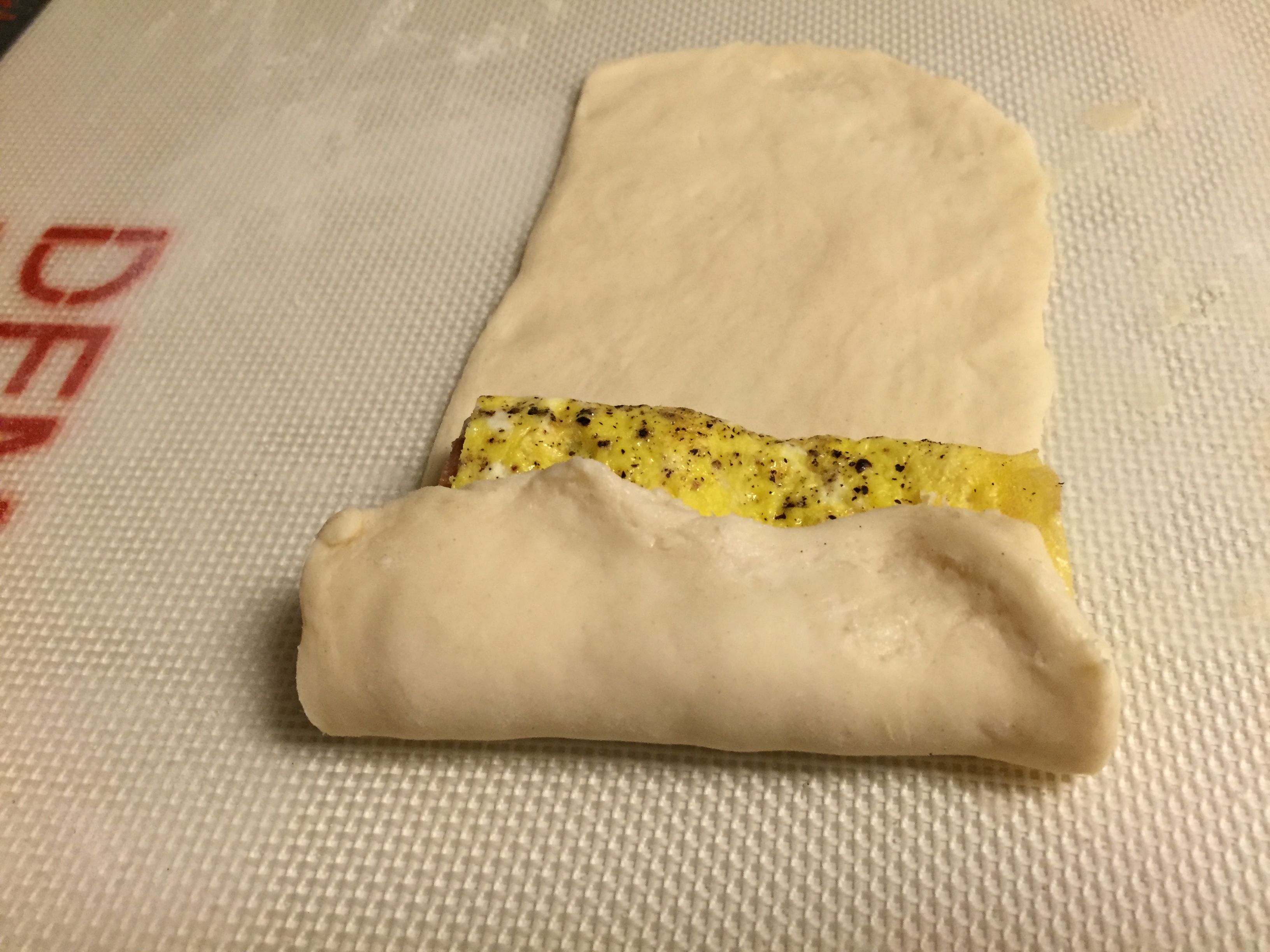 Roll each square out so it’s about 4″x8″. Place half of one of your egg roll-ups inside and roll.